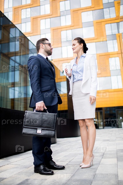 Бизнесмен и женщина разговаривают во время перерыва