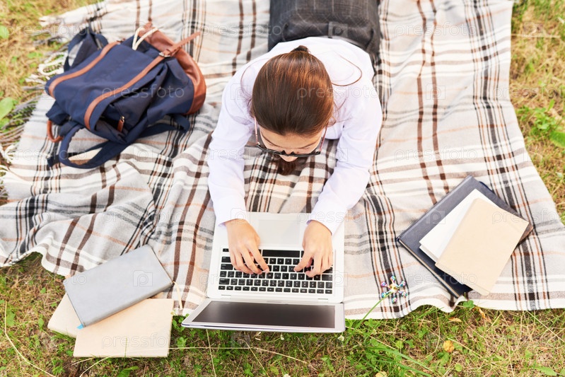 Ученица делает домашнее задание на улице