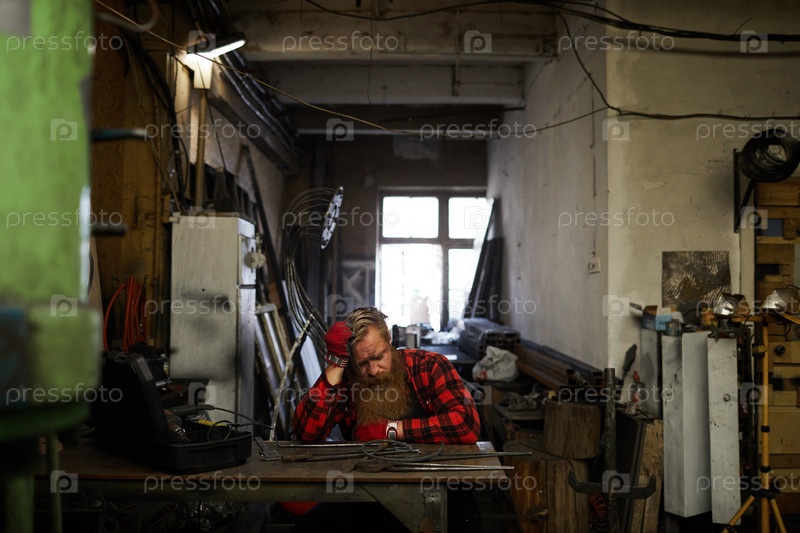 Исчерпанный мужской кузнец в опрокинутой мастерской