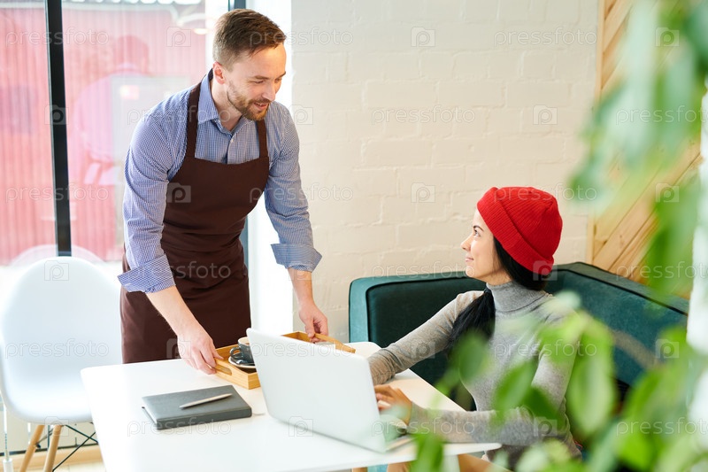 Официант обслуживает молодую женщину в кафе