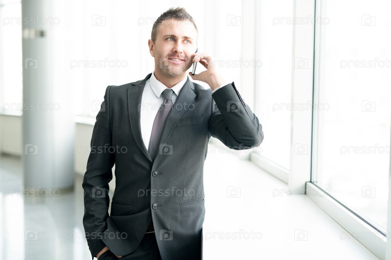Успешный бизнесмен разговаривает по телефону через окно