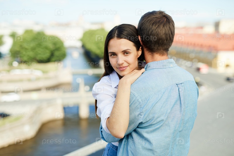 Контент привлекательная девушка обнимает бойфренда на крыше