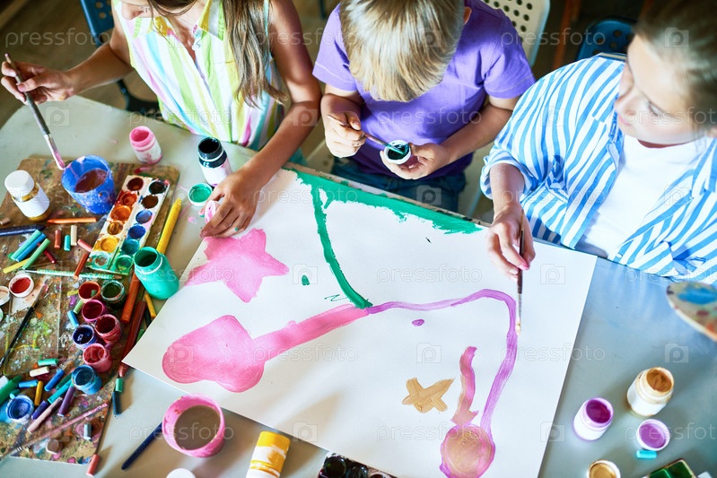 Группа детей рисуют картину вместе на уроке искусства