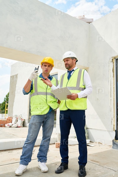Строительный бригадир разговаривает с рабочим