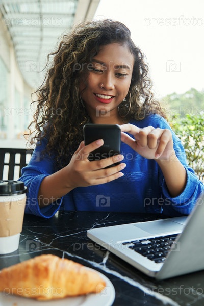 Веселая индонезийская женщина, использующая смартфон