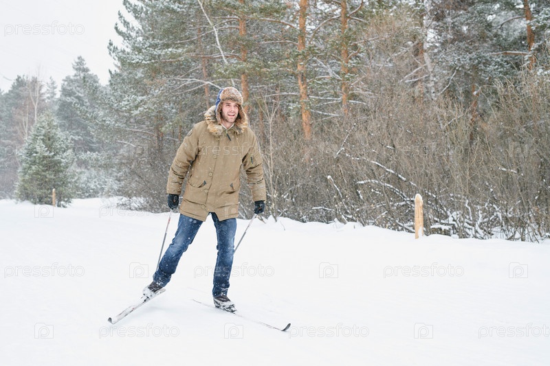 Молодой человек катается на лыжах в зимнем активном лесу