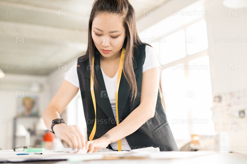 Молодая женщина, делающая одежду азиатская