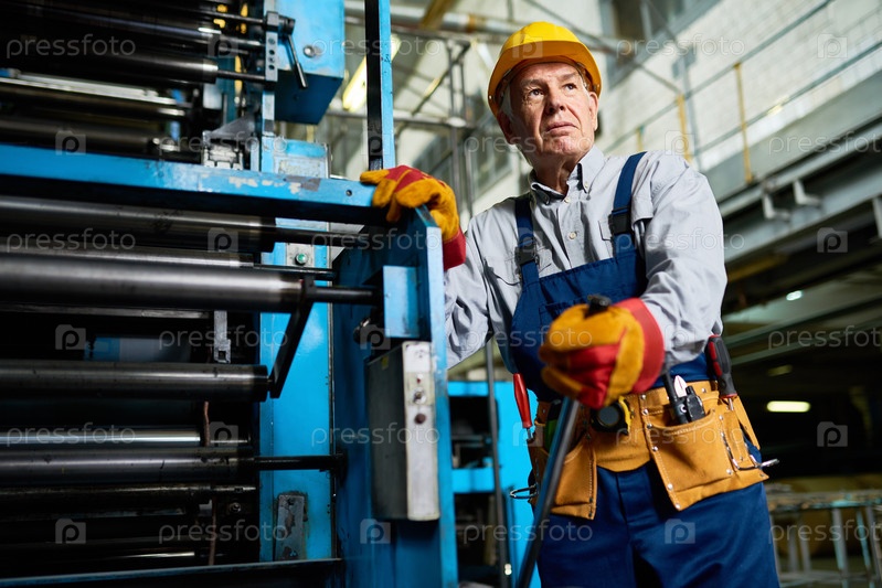 Старший работник, работающий с машинами на фабрике