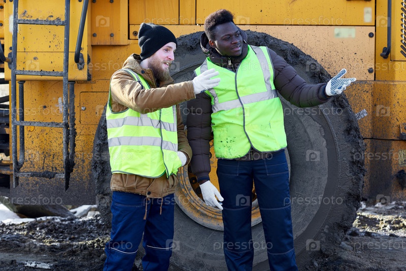 Тяжелые рабочие на площадке в открытом воздухе