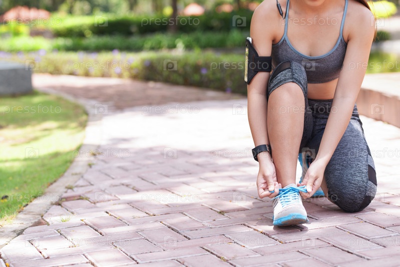 Женщина, выращивающая зерно, завязывает шнурки на тротуаре в парке
