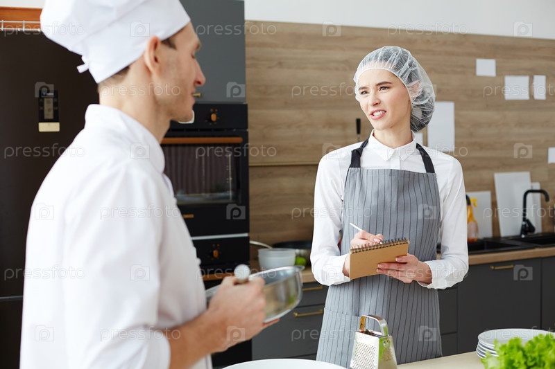Нахмуренная женщина обсуждает меню с шеф-поваром