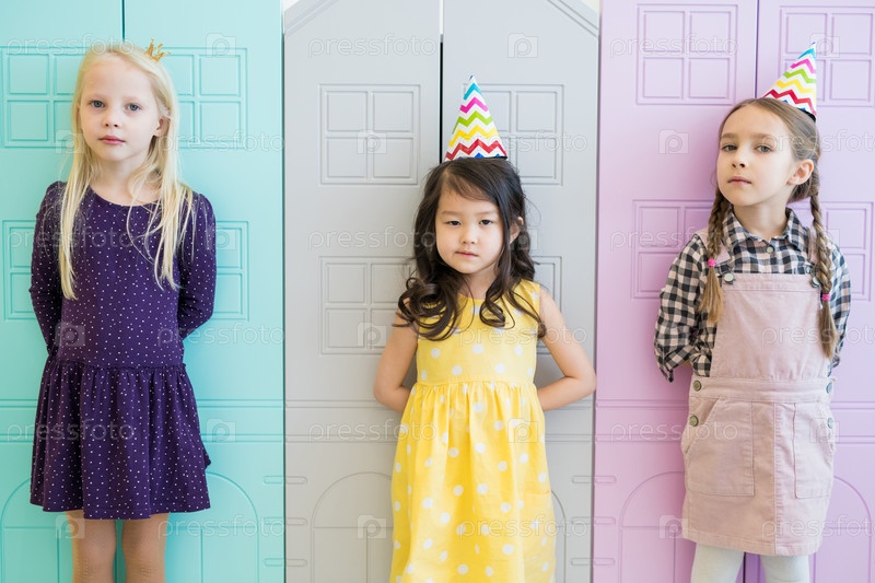 Уверенные в себе девушки, стоящие напротив дома мультфильмов