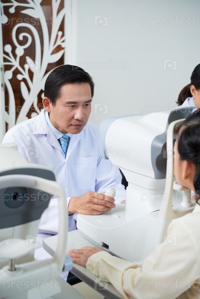 Серьезный врач проверяет зрение пациента