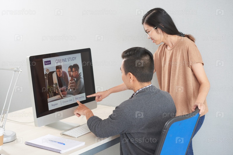 Коллеги обсуждают онлайн-курс обучения на компьютере