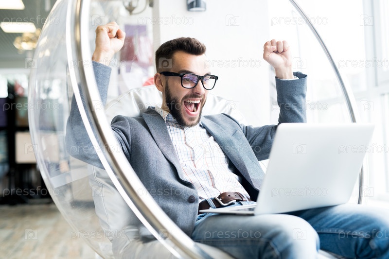 Взволнованный бизнесмен, использующий ноутбук