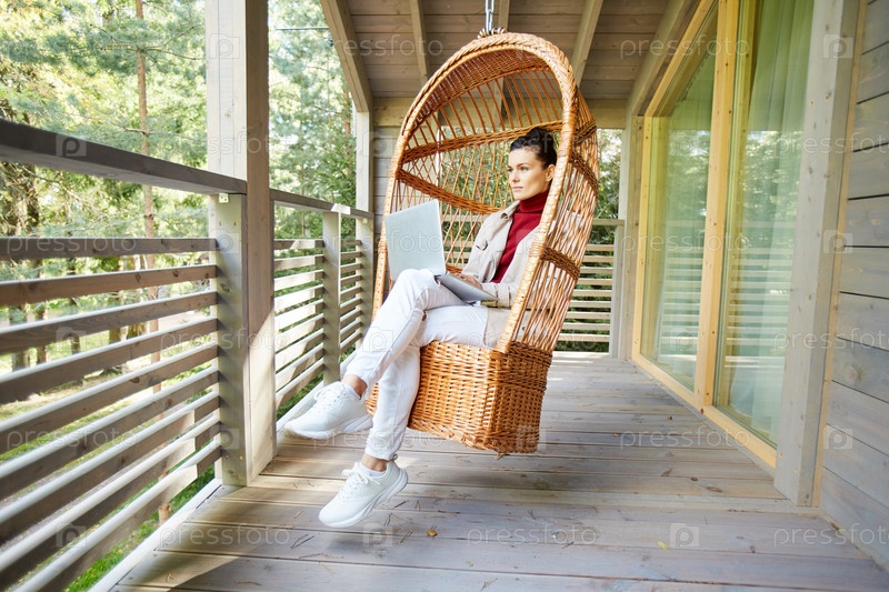 Пенсивная леди фрилансер работает на балконе