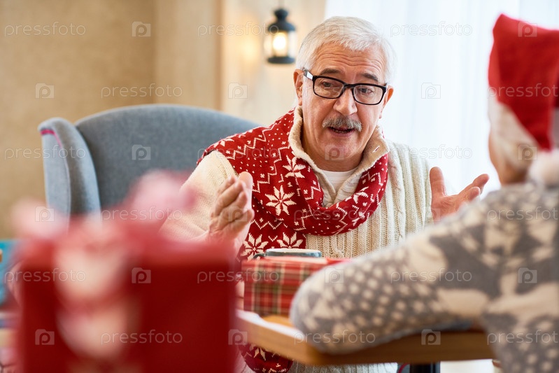 Старший мужчина разговаривает со своей женой на рождественском обеде