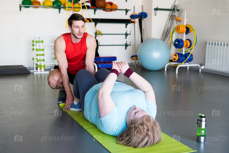 Женщина с ожирением делает судороги в оздоровительном клубе