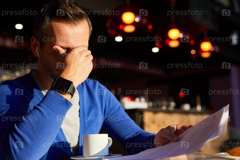 Уставший мужчина чувствует усталость глаз на работе