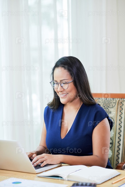 Веселая азиатская бизнесвумен использует ноутбук в офисе