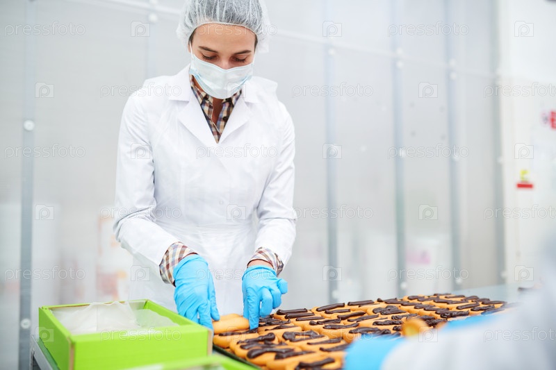 Работник фабрики кондитерских изделий упаковывает готовую выпечку