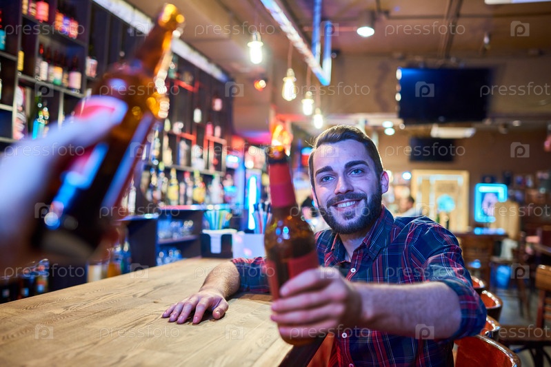 Счастливый молодой человек, стучащий бутылки на барной стойке