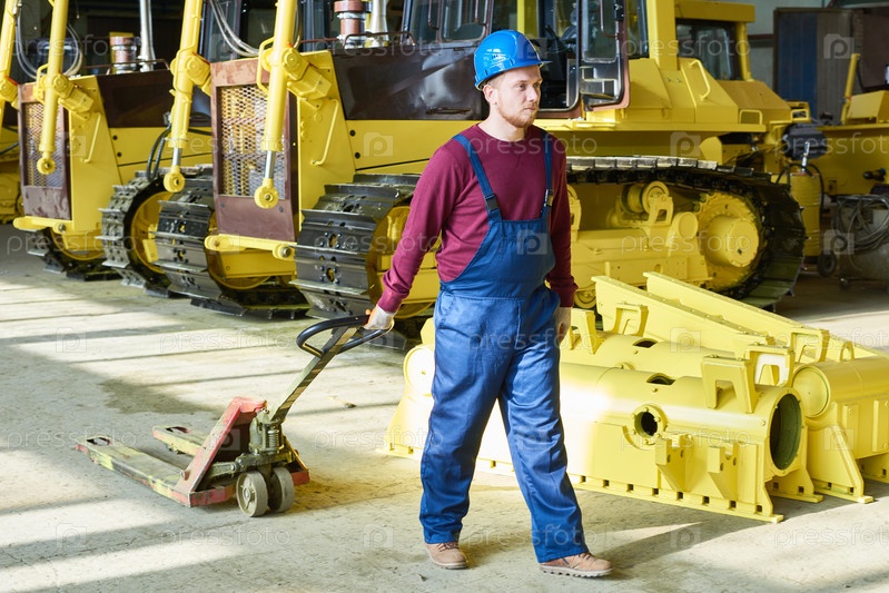 Фабричный работник, работающий с поддоном паллетный джек