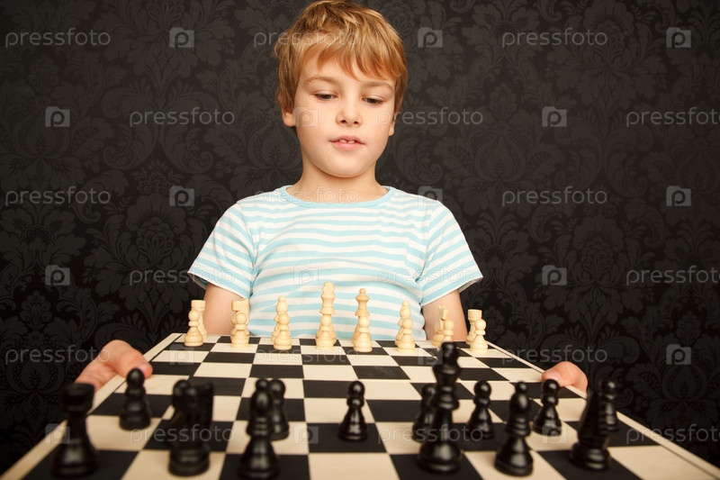Мальчик на черном фоне играет в шахматы