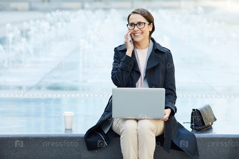 Веселый независимый консультант разговаривает по телефону