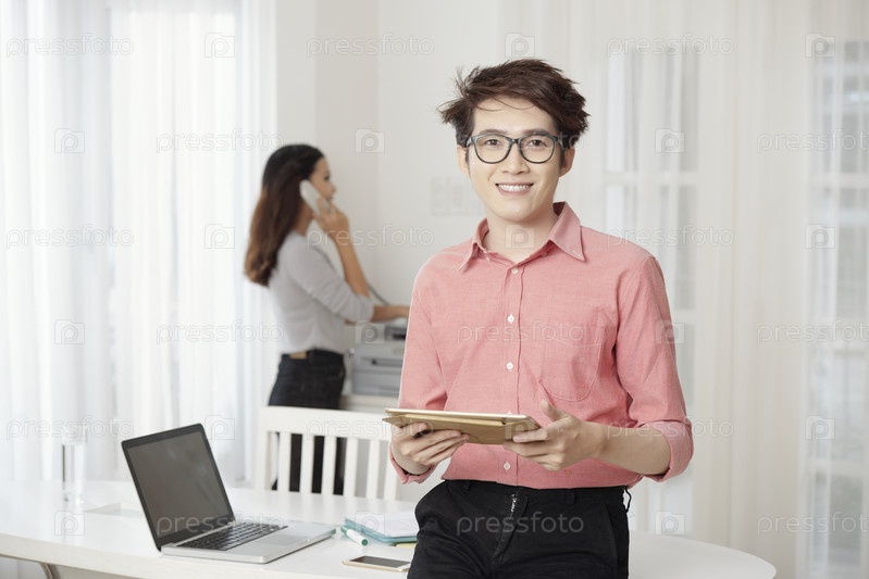 Улыбающийся мужчина с планшетом в офисе
