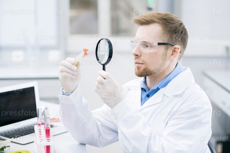 Ученый изучает образец мяса через лупу
