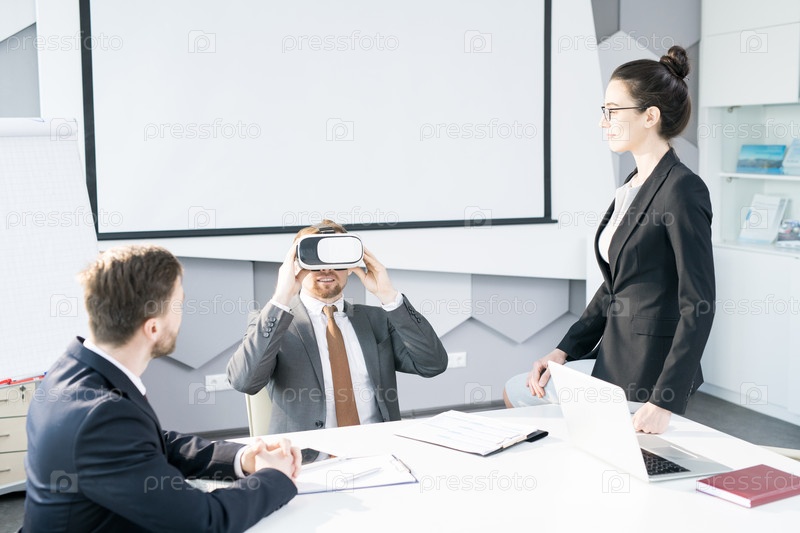 Бизнесмен наслаждается VR-гарнитурой на встрече