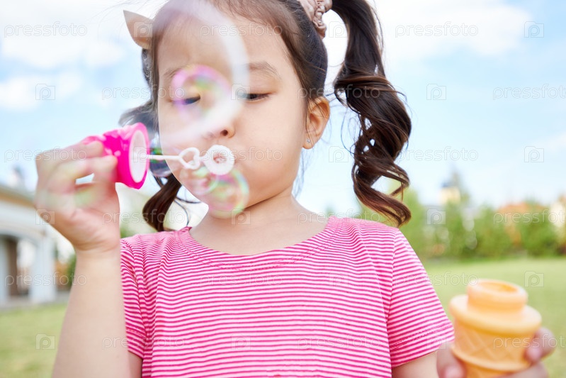 Милая азиатская девушка дует пузыри на открытом воздухе