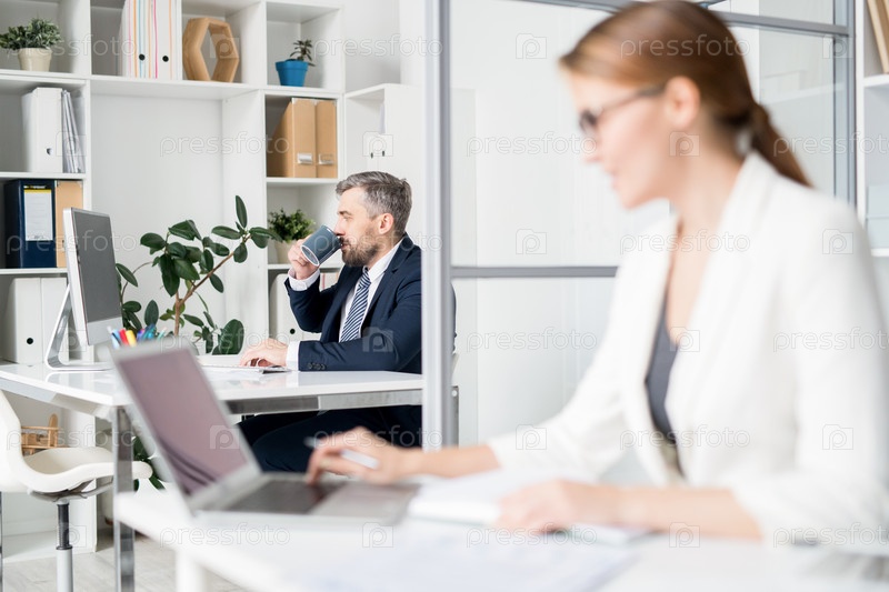 Бизнесмен пьет кофе, работая в офисе