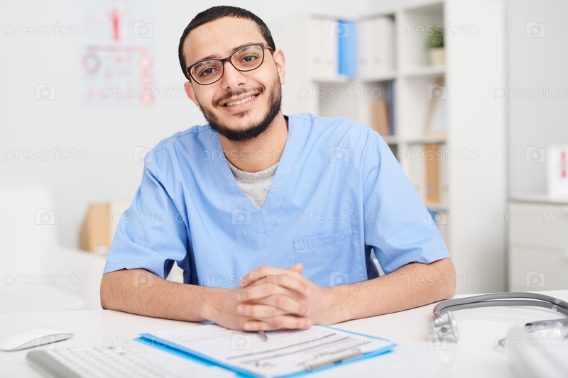 Улыбающийся врач с Ближнего Востока позирует за столом
