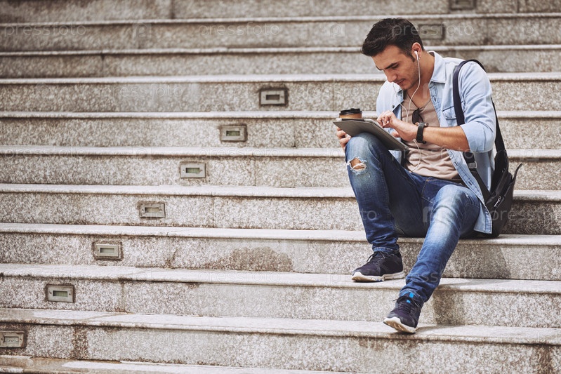 Человек с планшетом сидит на ступеньках
