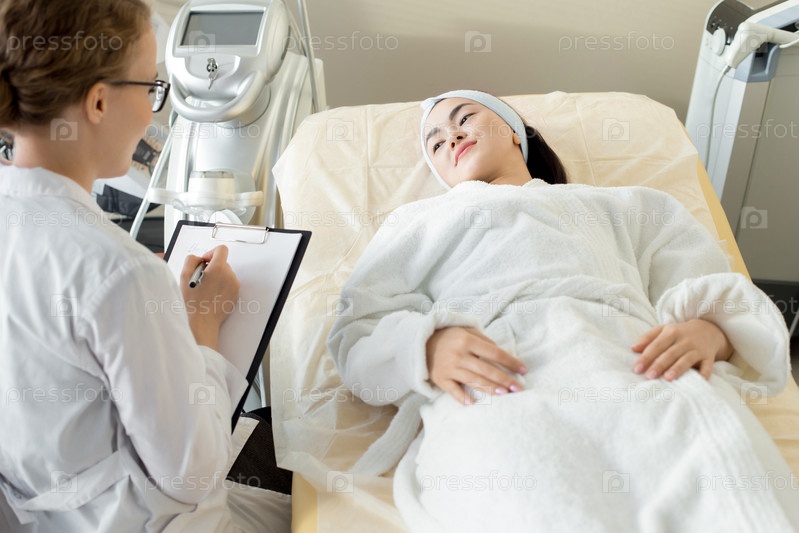 Азиатская женщина слушает косметолога