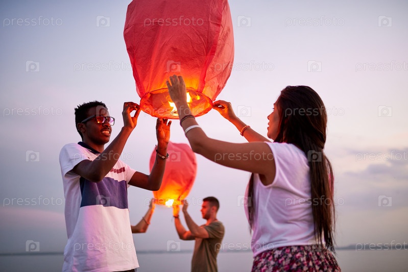 Улыбающаяся пара запускает китайские фонарики как символ любви