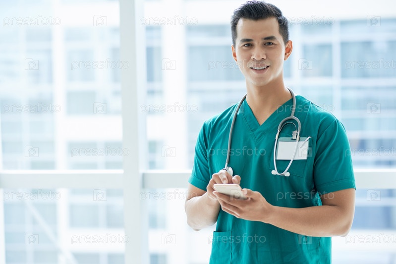 Улыбающийся врач просматривает смартфон