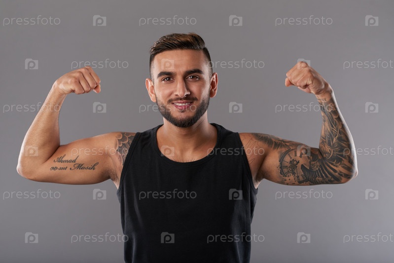 Улыбающийся татуированный мужчина показывает бицепсы