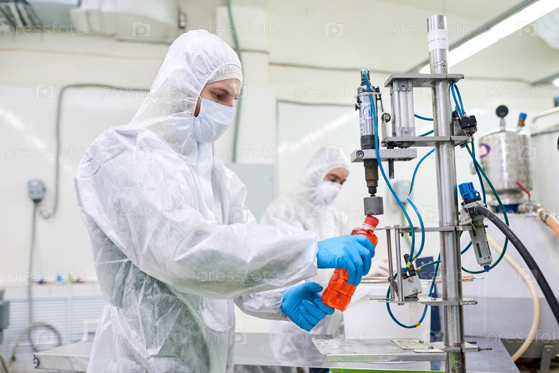 Фабричный рабочий закрывает бутылку со спортивным напитком