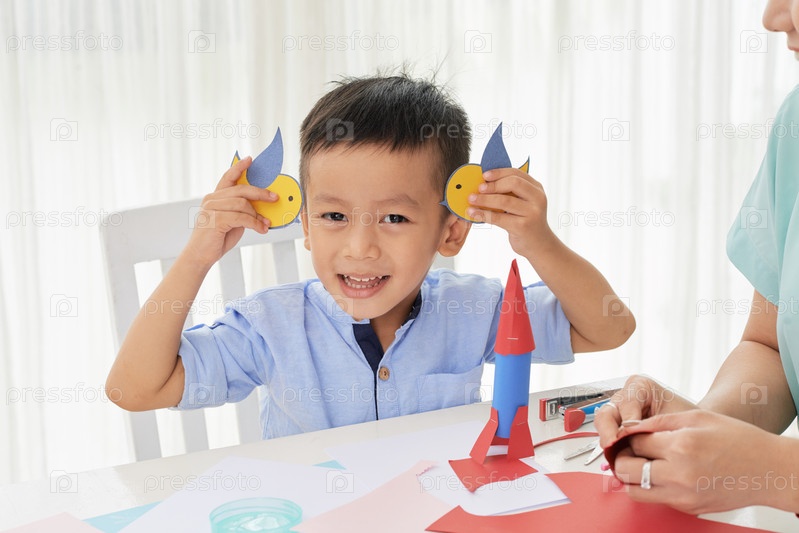 Мальчик развлекается бумажными птицами