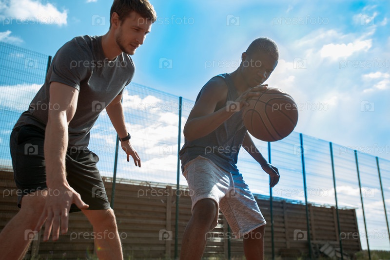 Два молодых человека играют в баскетбол