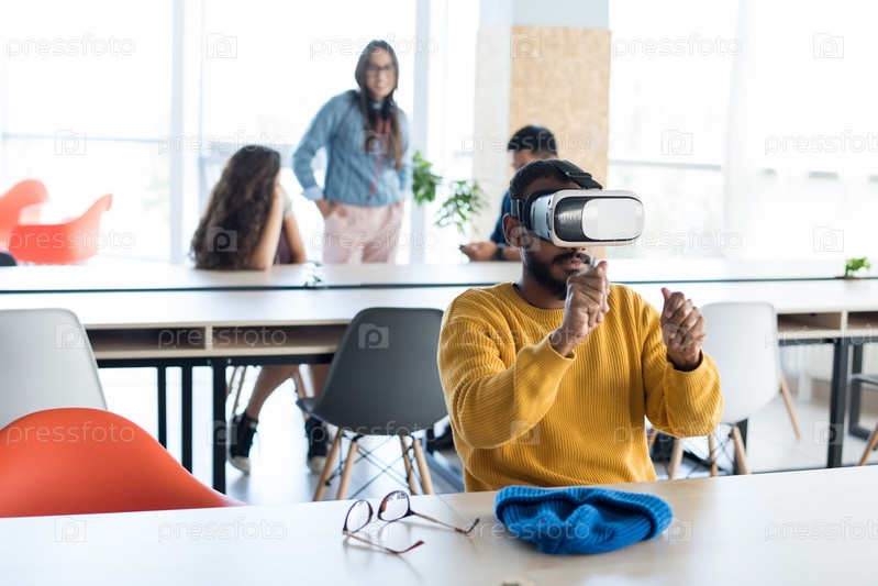 Любопытный хипстер играет в видеоигру на гарнитуре VR