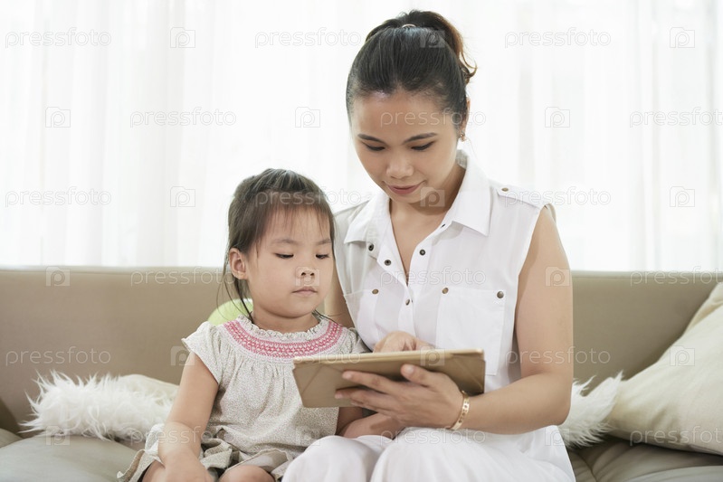 Мать показывает мобильное приложение