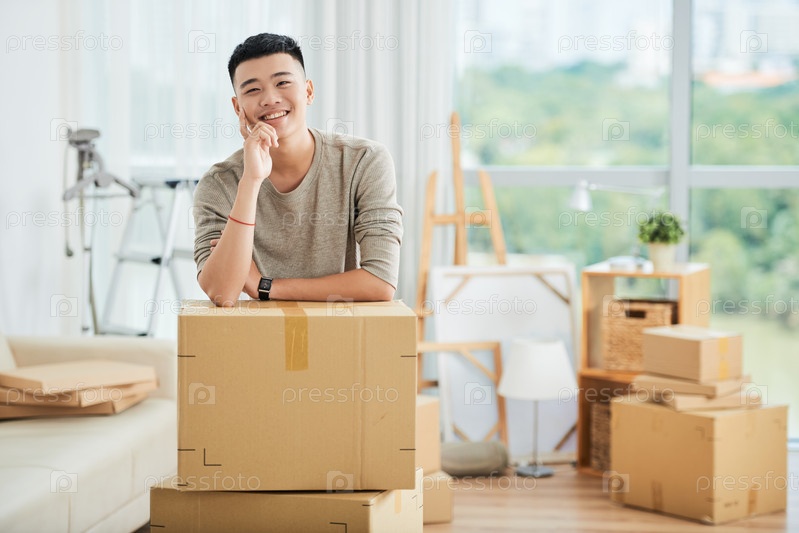 Улыбающийся азиатский мужчина в упакованных картонных коробках