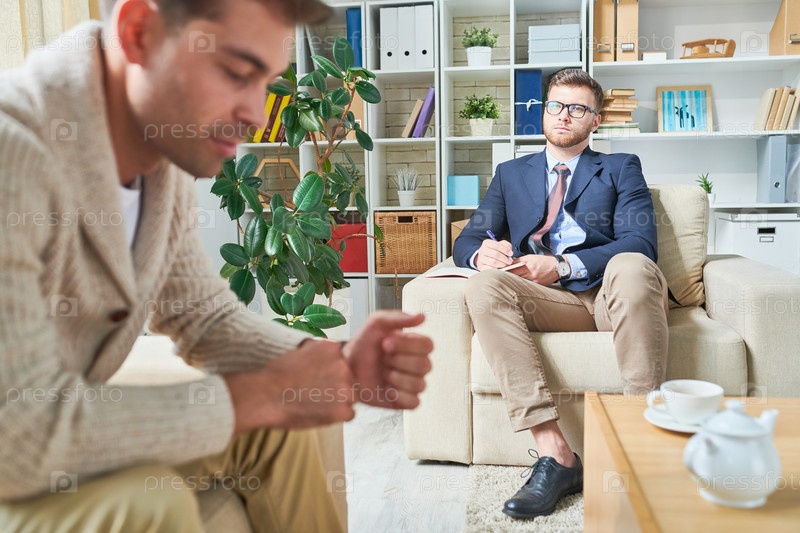 Размышляющий психолог внимательно слушает проблемы пациентов