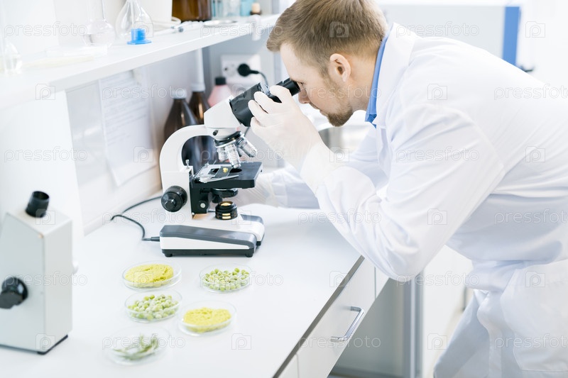 Мужчина-ученый изучает зеленые овощи под микроскопом