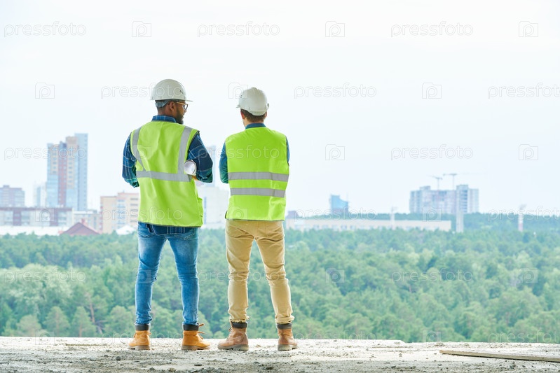 Анонимные инженеры-строители смотрят на город