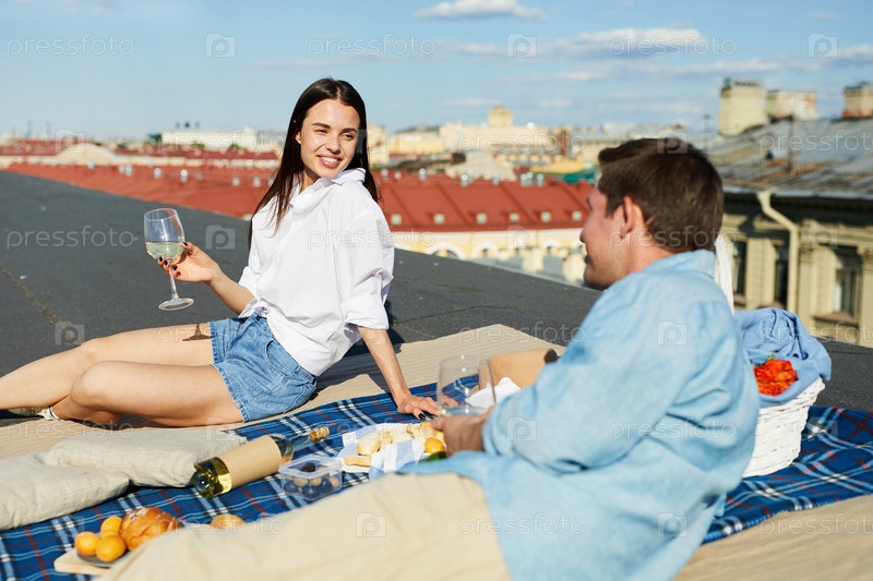 Улыбающаяся девушка слушает своего бойфренда на крыше